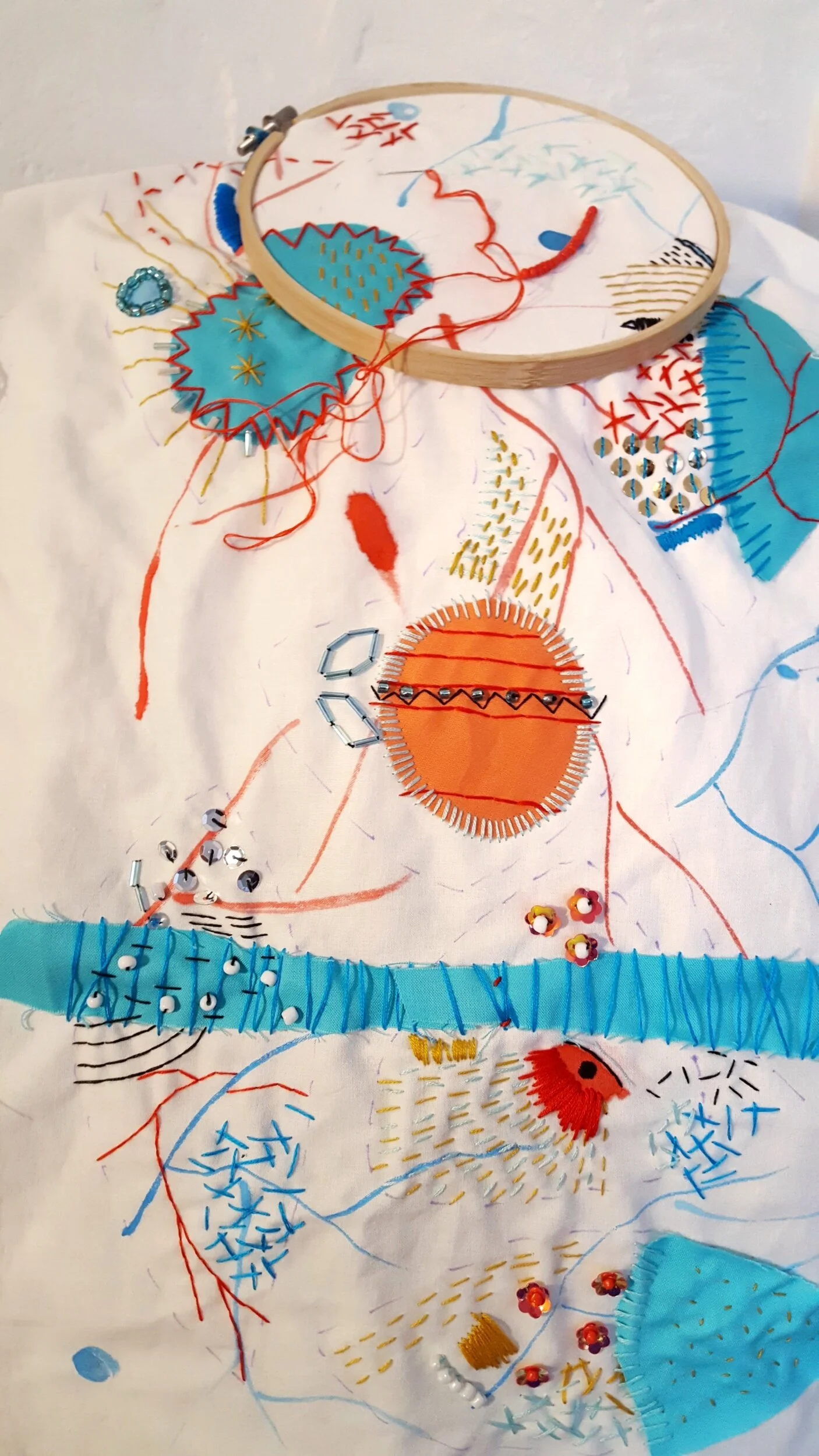 I have been working on an continuous experimental embroidery project. It is sometimes a bit intimidating to sit down with a huge piece of fabric and start stitching.